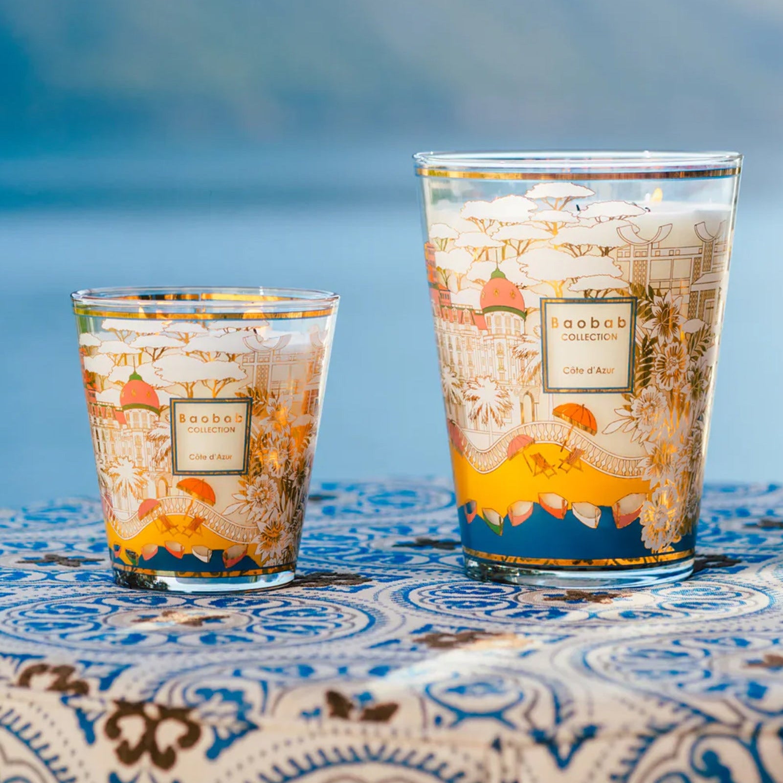 Le décor sérigraphié de la bougie Côte d’Azur s’est inspiré de quelques éléments du dessin de Thierry Larcher, comme le Negresco et la mythique promenade des Anglais. Nous avons souhaité aller plus loin en intégrant des éléments architecturaux de la ville de Menton et ceux de la ville de Saint-Tropez. On imagine, dans l’arrière-pays, ces forêts de pins parasols et on rêve de visiter la Fondation Maeght, située dans les hauteurs de Saint-Paul-de-Vence.