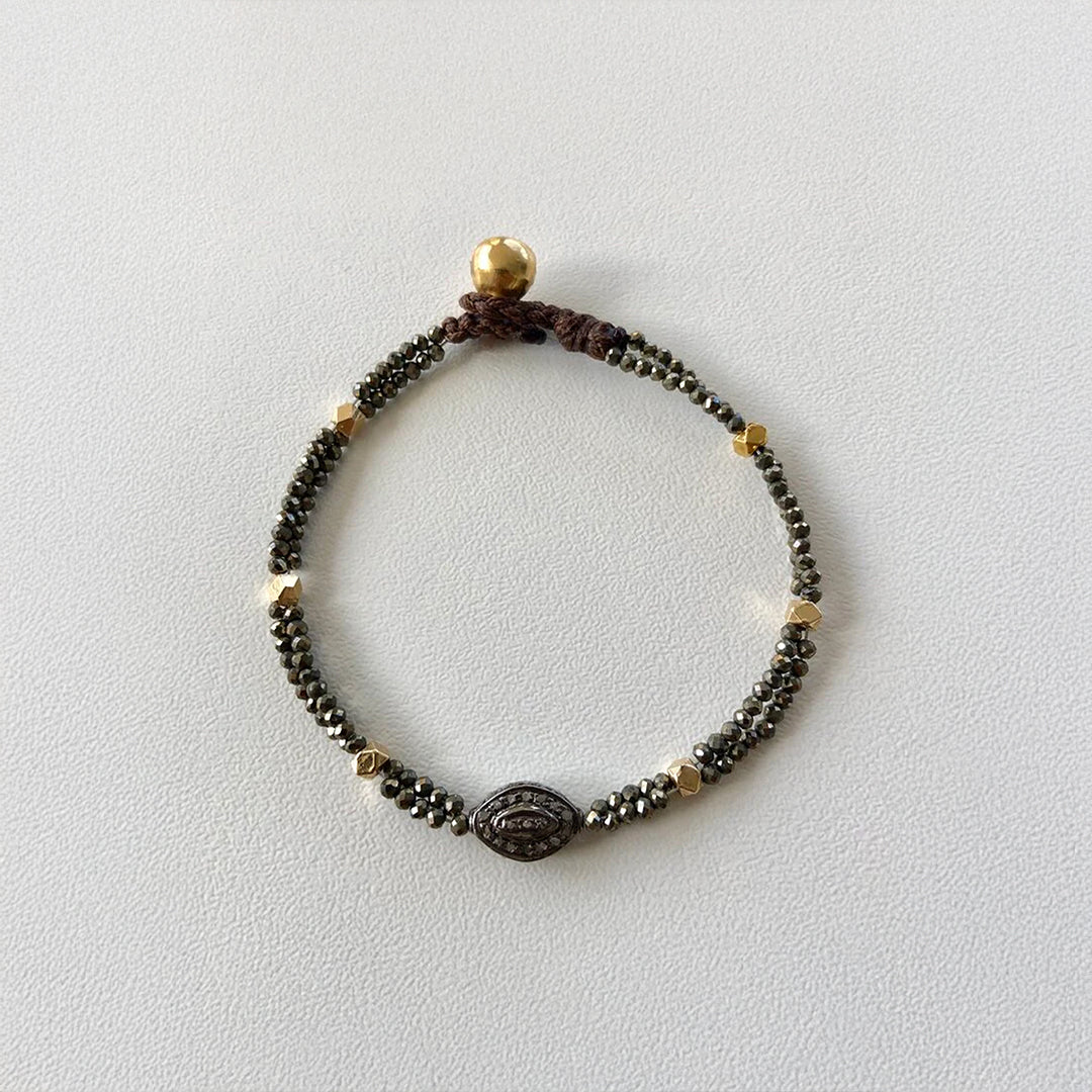 L'ADN de la marque qui fait son originalité, c'est l'alliance de matières roots et confort ( pour les bases: fil huilé, macramé) et de matériaux précieux ( plaqué or 3 microns/or/ pierres précieuses et semi précieuses) qui donne des lignes résolument rétro chic. Tous les matériaux, toutes les pierres viennent de Jaipur en Inde.
